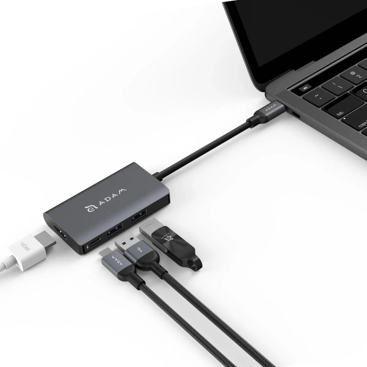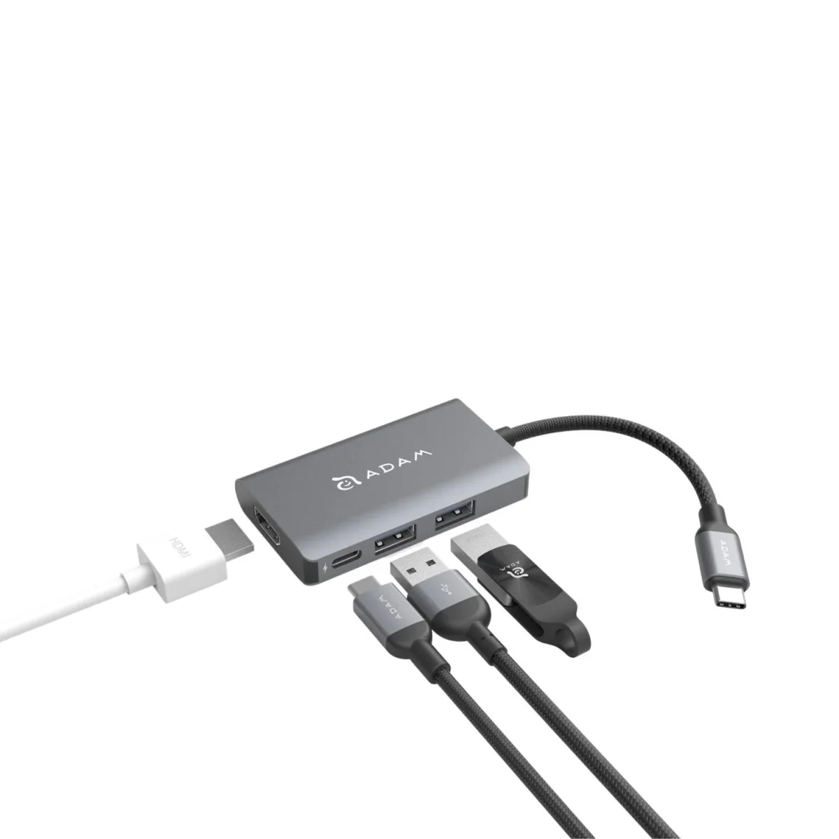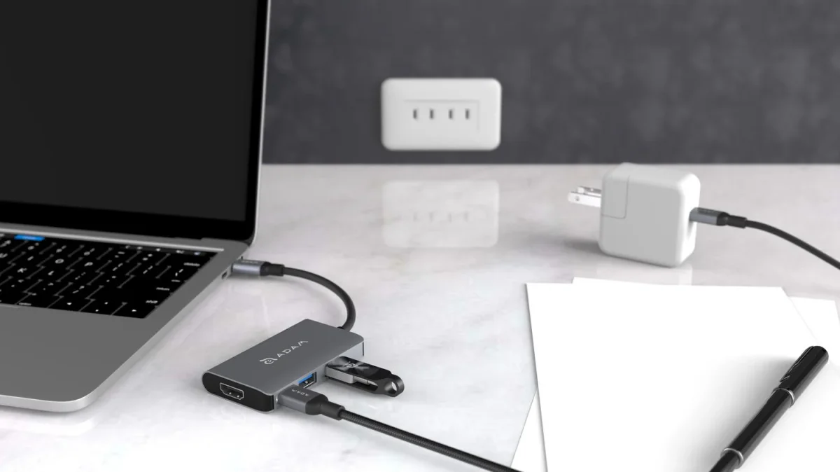 Adaptador multipuertos USB-C cuatro en uno, versátil y estético diseñado para satisfacer todas sus necesidades. Mejor conectividad y visión más amplia en un mismo dispositivo. El dispositivo USB se carga mientras se transfieren datos.