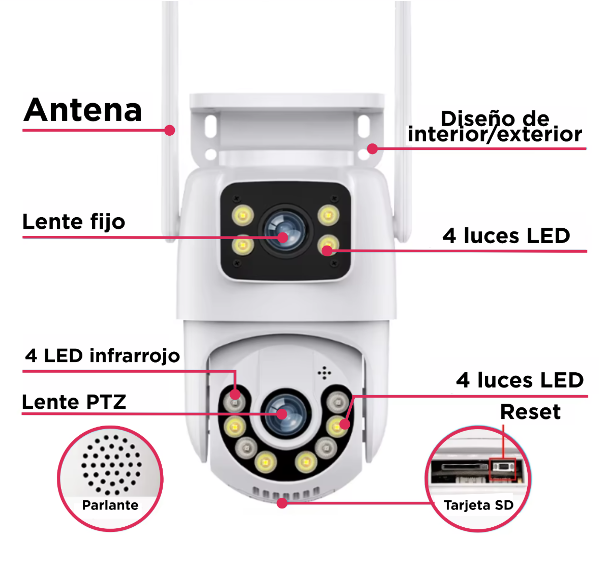 Esta cámara incorpora tecnología de cancelación de ruido en micrófono y altavoz. Puedes hablar de forma remota con los visitantes exteriores de forma clara y fluida a través de la aplicación. Compatible con todas las plataformas (IOS, Android). Puedes configurar la visión nocturna infrarroja para cambiar a focos y sonar una alarma. Los reflectores también se pueden iluminar toda la noche para lograr a todo color día y noche