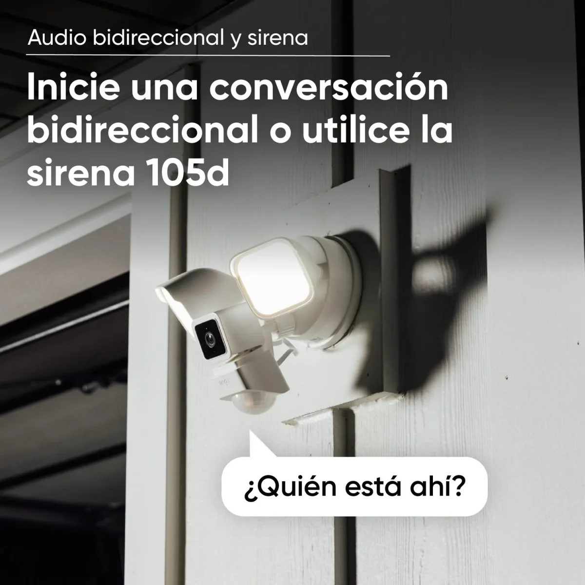 - Audio bidireccional para escuchar y responder. Incluye altavoz de 90 dB y una sirena de 105 dB para ahuyentar a los intrusos con sonido