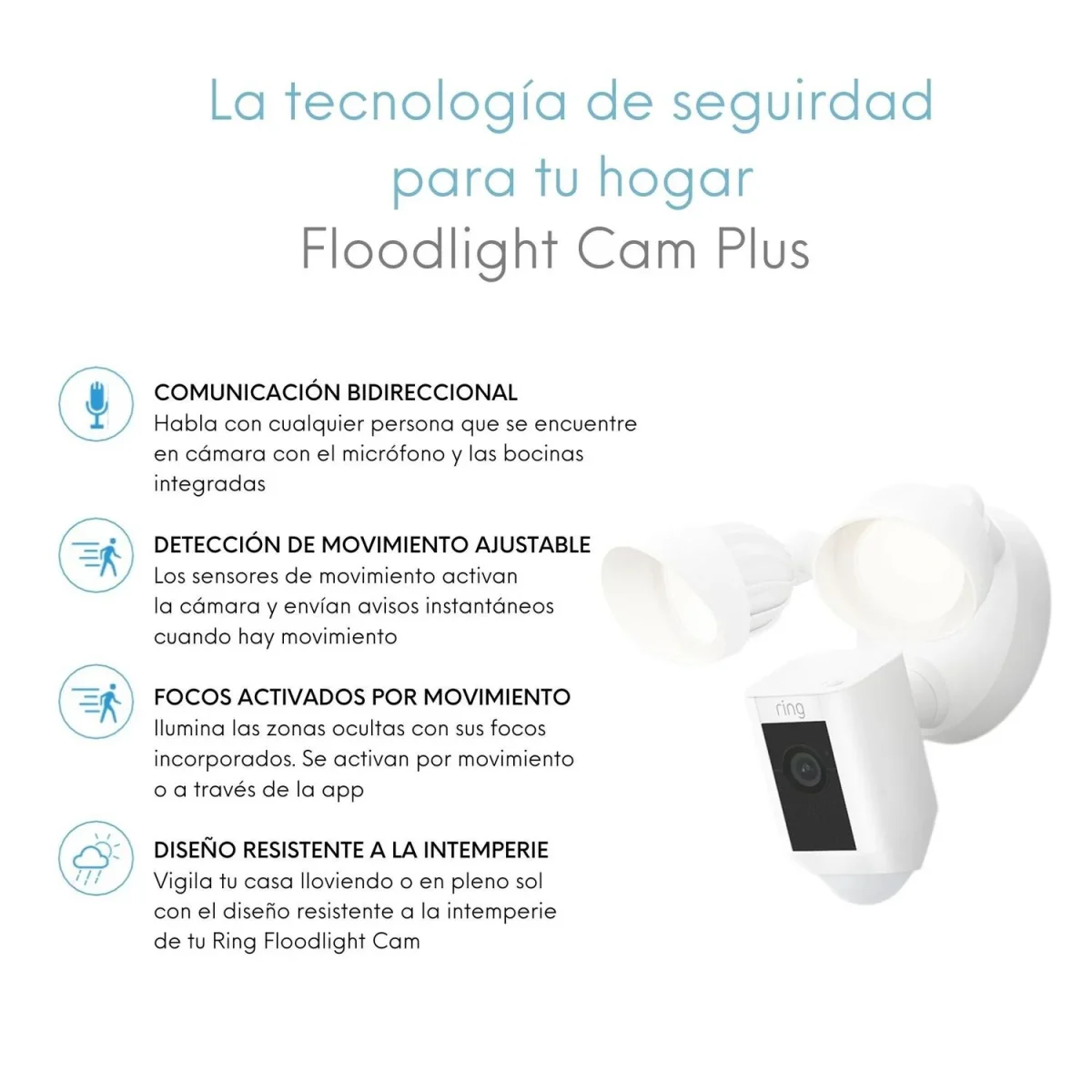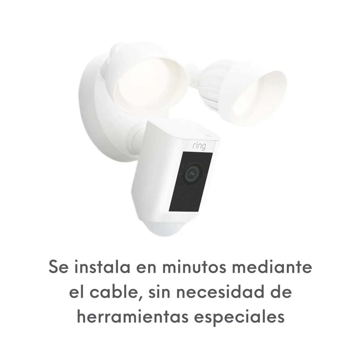 La cámara de seguridad exterior con cable Floodlight Plus tiene sensores y reflectores incorporados que se activan por movimiento, alarma de seguridad y audio bidireccional durante el día o la noche. Con la tecnología más evolucionada de seguridad para el hogar. Se instala en 10 minutos.