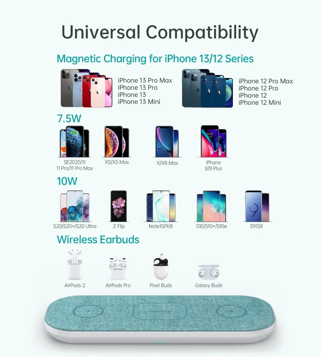 La plataforma de carga inalámbrica Choetech 3 en 1 admite la carga de 3 dispositivos habilitados para qi al mismo tiempo con una velocidad de carga normal. La bobina central de la plataforma de carga está perfectamente diseñada para cargar nuevos airpods. Nuestro cargador inalámbrico triple tiene como objetivo brindar la experiencia de carga inalámbrica más conveniente, especialmente para múltiples dispositivos. NO es compatible con relojes Qi como Apple Watch, Samsung Watch.