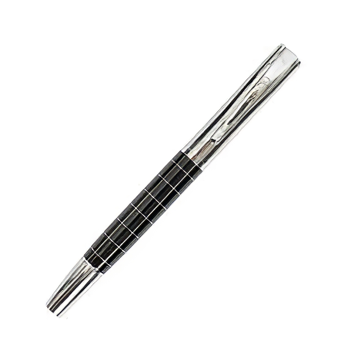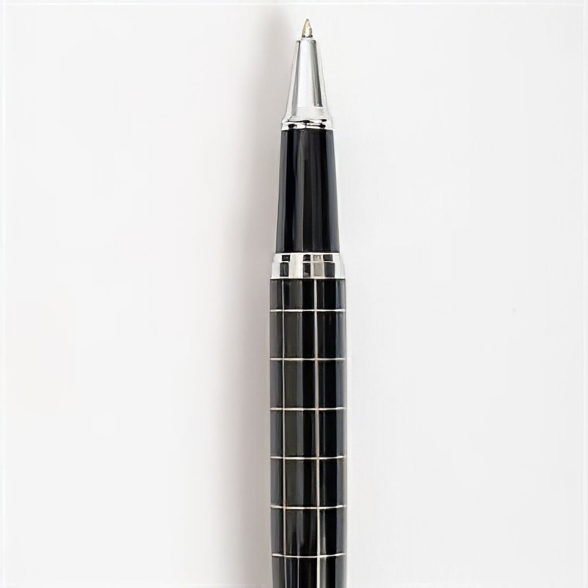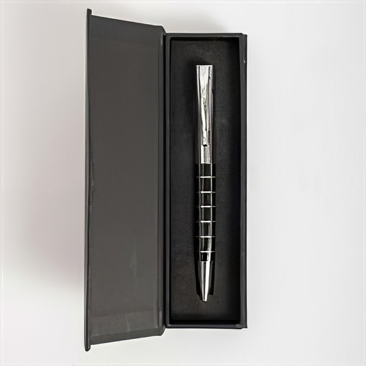 Lapicera con tapa , tinta azul y cuerpo metálico. Cada unidad viene en un estuche de cartón rígido con logo en hot stamping.