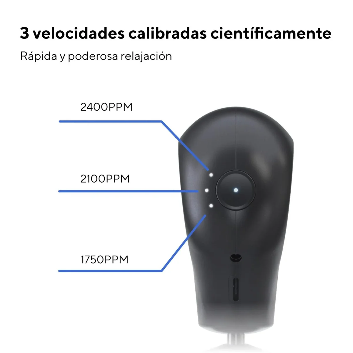 • Cuando se trata de velocidad, Mini te permite elegir entre 3 configuraciones de velocidad (1750, 2100 y 2400 percusiones por minuto), cada una de ellas científicamente calibrada para brindar mayores beneficios terapéuticos para el cuerpo